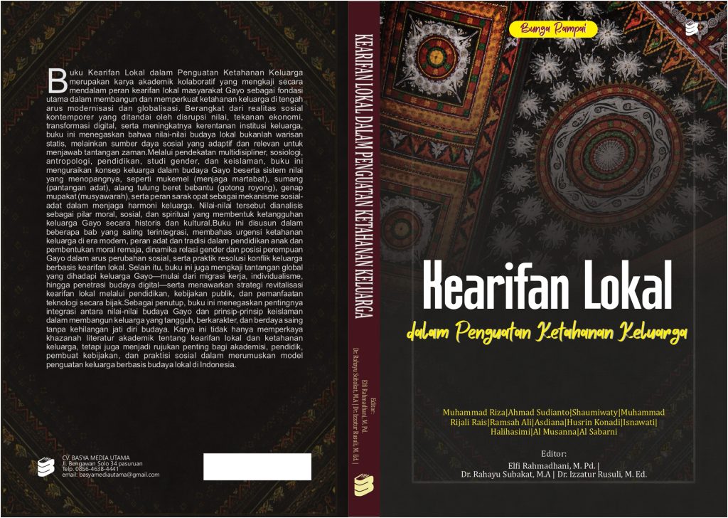 Buku Kearifan Lokal dalam Penguatan Ketahanan Keluarga merupakan karya akademik kolaboratif yang mengkaji secara mendalam peran nilai-nilai budaya masyarakat Gayo sebagai fondasi utama dalam membangun ketahanan keluarga di tengah arus modernisasi dan globalisasi. Di tengah realitas sosial kontemporer yang diwarnai disrupsi nilai, tekanan ekonomi, transformasi digital, serta melemahnya institusi keluarga, buku ini menegaskan bahwa budaya lokal bukanlah warisan statis, melainkan sumber daya sosial yang adaptif dan relevan untuk menjawab tantangan zaman.