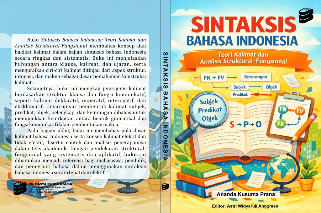 Pada bagian akhir, buku ini membahas pola dasar kalimat bahasa Indonesia serta konsep kalimat efektif dan tidak efektif, disertai contoh dan analisis penerapannya dalam teks akademik. Dengan pendekatan struktural-fungsional yang sistematis dan aplikatif, buku ini diharapkan menjadi referensi bagi mahasiswa, pendidik, dan pemerhati bahasa dalam menggunakan sintaksis bahasa Indonesia secara tepat dan efektif.